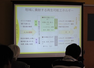 今回の講座会場をご提供いただいた「おひさま進歩エネルギー株式会社」社長の原氏からは、飯田信金とのエコファイナンスと飯田市からの補助金を使って、市民が0円で太陽光パネルを設置できる市民ファンド「0円システム」導入の経緯と、その仕組みなどをお話しいただきました。