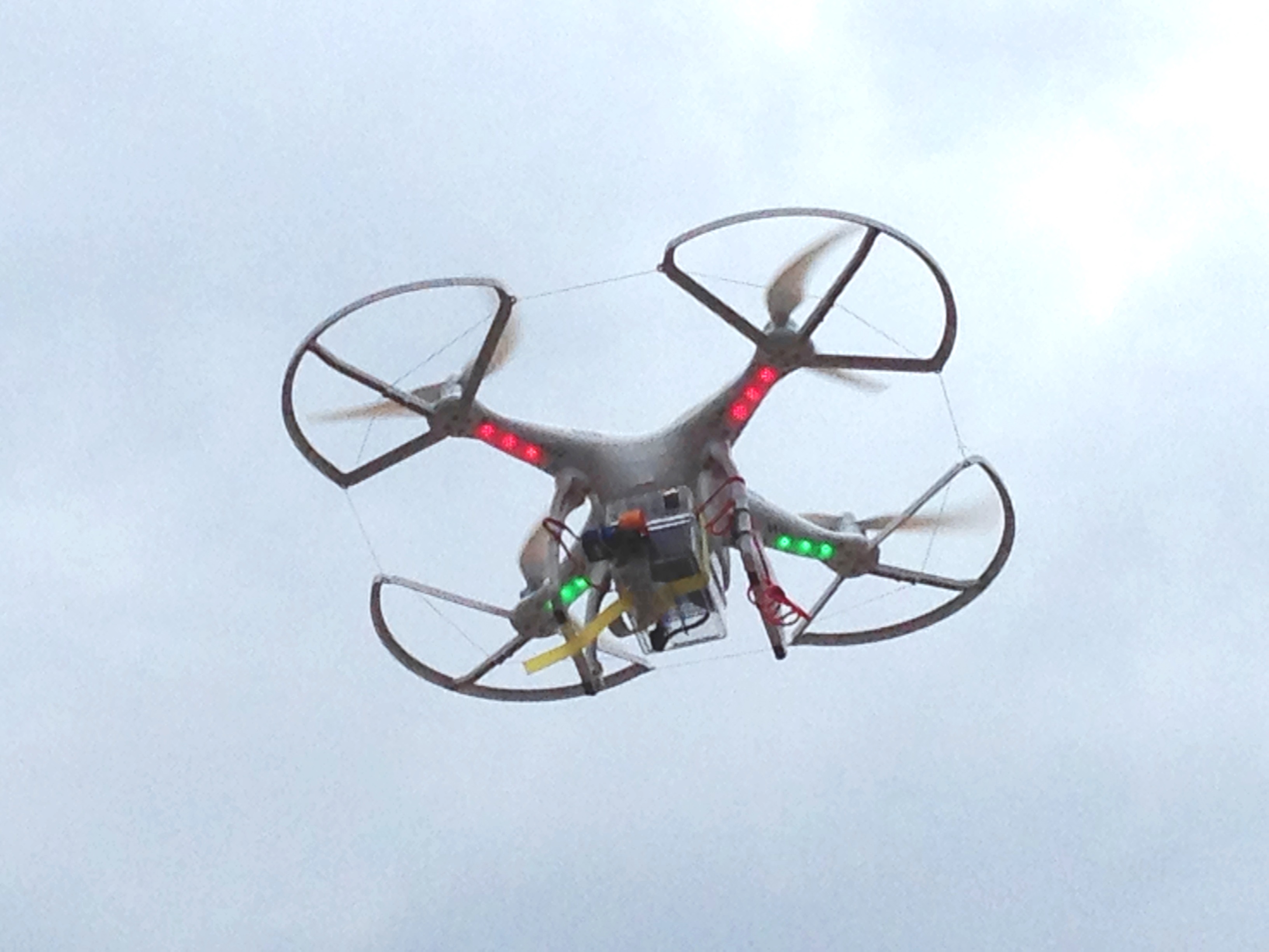 ところが、現場のビルはどこからも屋根の上を見ることができず、二段梯子を用いても屋根の状況を確認することができません。そこで、弊社開発部門で別の用途に向けてテスト中のマルチコプターを借り、無事に屋根の状態を確認することができました。設置コストを下げるためにも高所作業車を使用することは難しく、マルチコプターを有効活用することで安全かつ低コストで作業を行うことができました。今後もこのようなケースが増えるのでは?と、感じています。